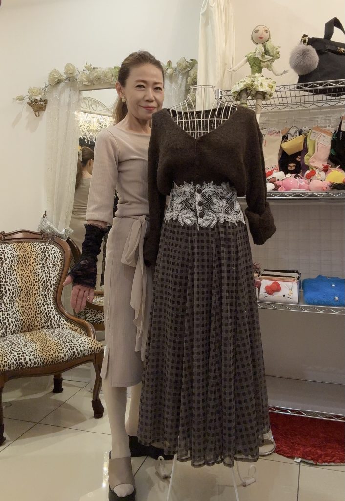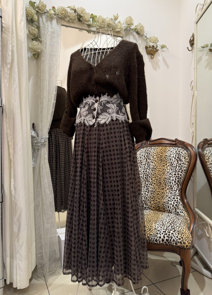 シフォンチェックスカートが何気にきらきらなのは裏地がきらきらだから ✨✨✨