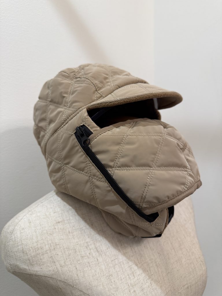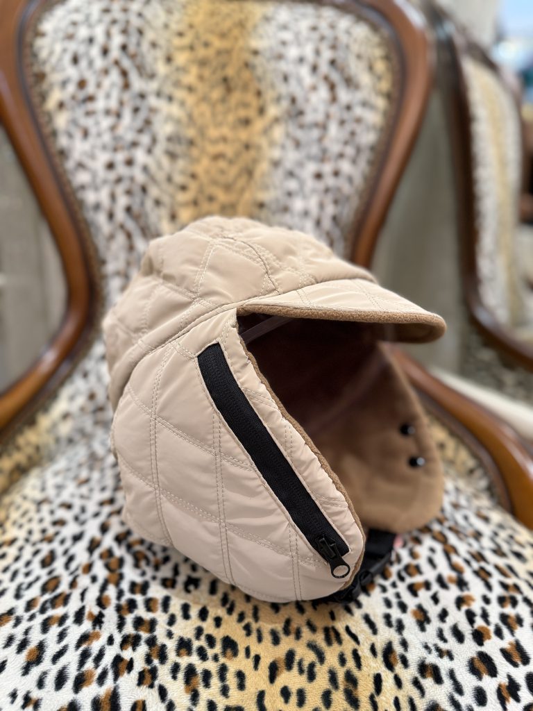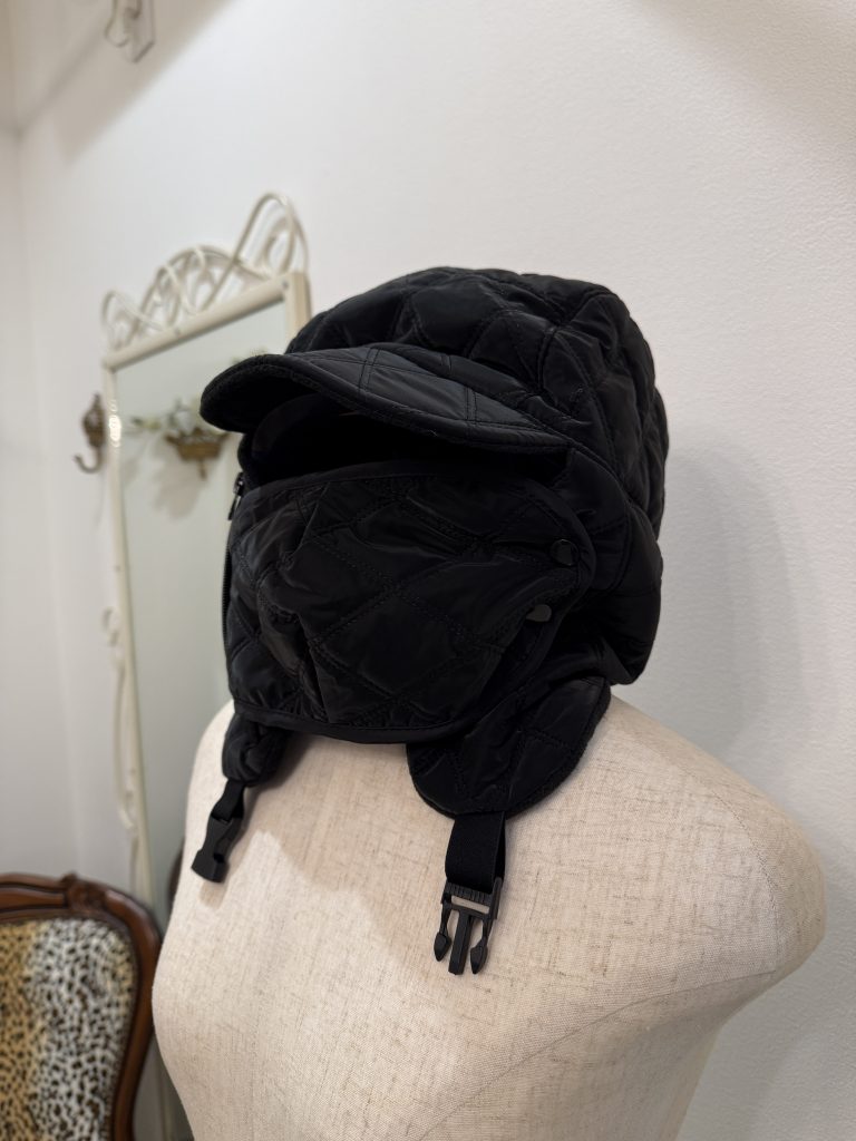 耳元収納兼ねてるような中綿入りキルティング防寒お帽子 ファスナーの正体は