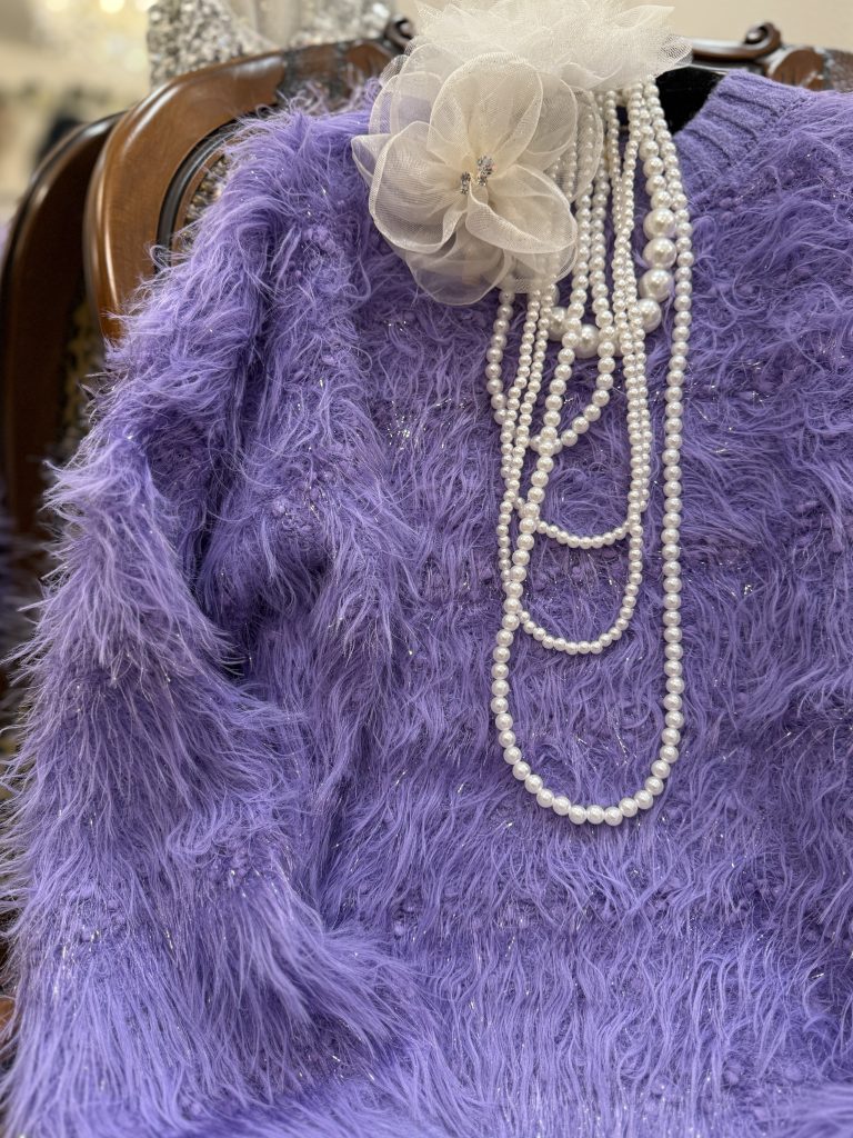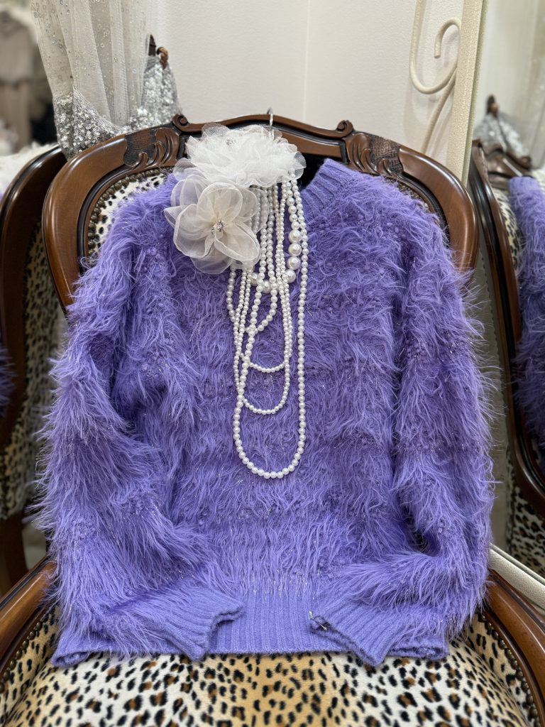 ラメが混じったウェービーな毛並みのセーターお色が美しすぎます 💜💜💜
