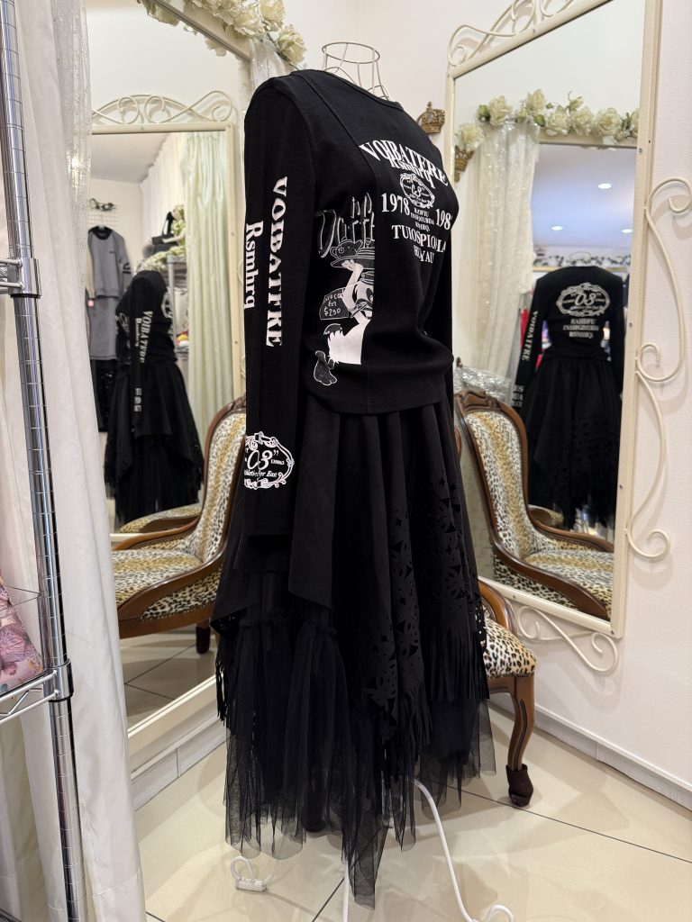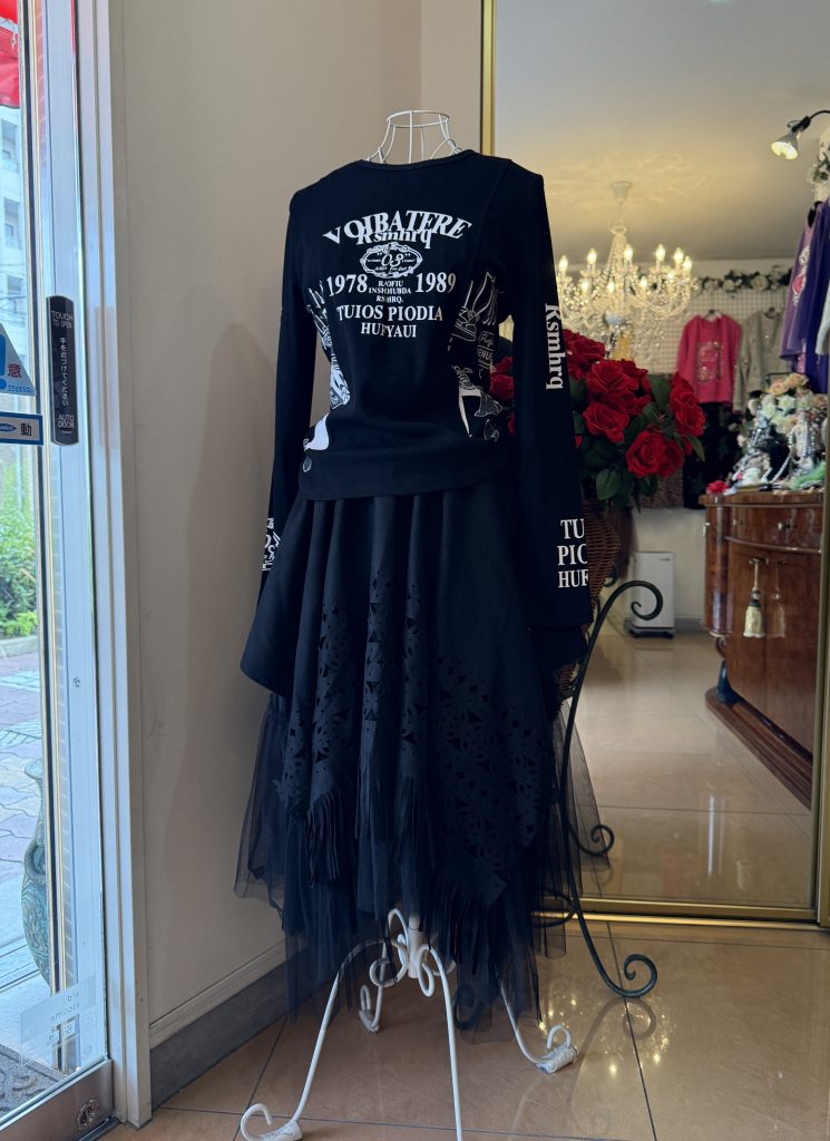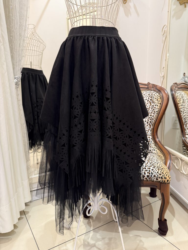 スエード調パンチングフリンジチュール重ね ★ 個性派スタイルスカートcoolブラック